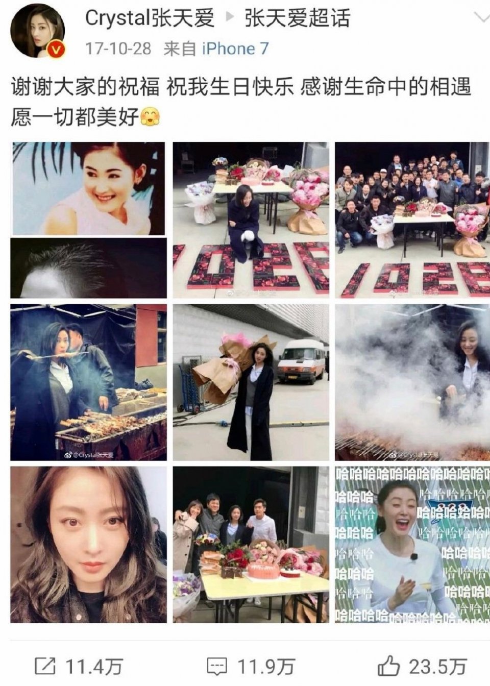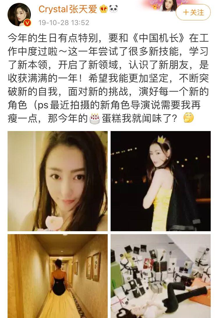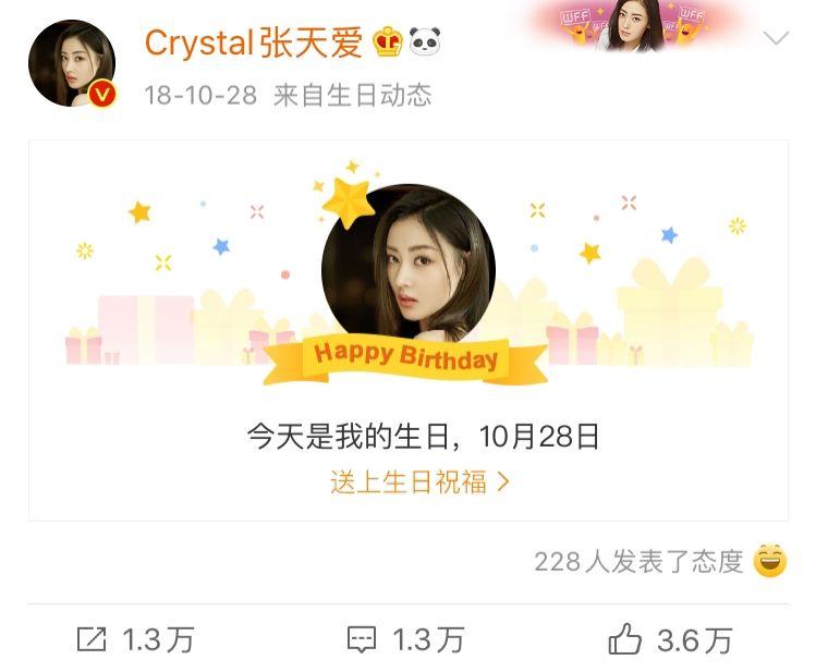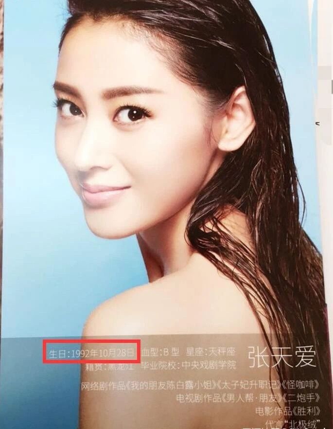所以真的是90年?话说张天爱在1990年出生这一信息的确持续了蛮久。再翻看张天爱的微博也不难发现,近几年的她都在10月28日这天庆祝自己的生日。