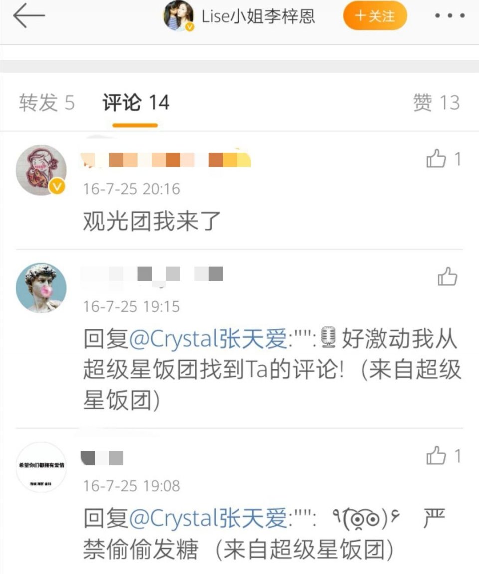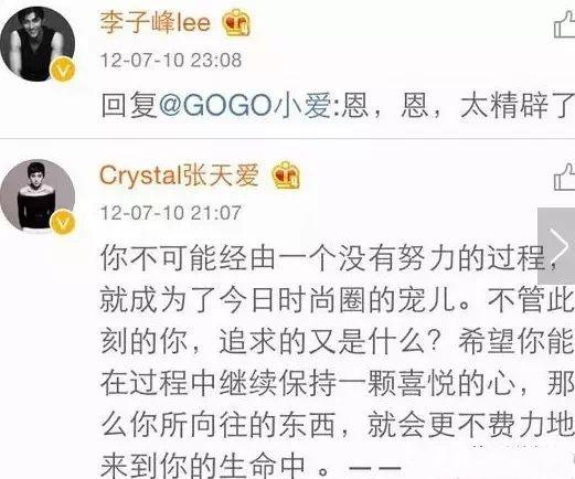张天爱和李子峰两人当时在微博上的互动不少,想必感情也蛮好的。另外,值得注意的是那个时候张天爱的微博名称是gogo小爱。