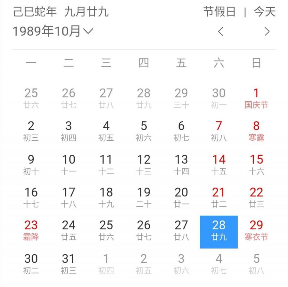再去查看日历,从85年到90年期间,刚好有一个日期对应上了。1989年农历9月29日,恰好就是国历的10月28日。
