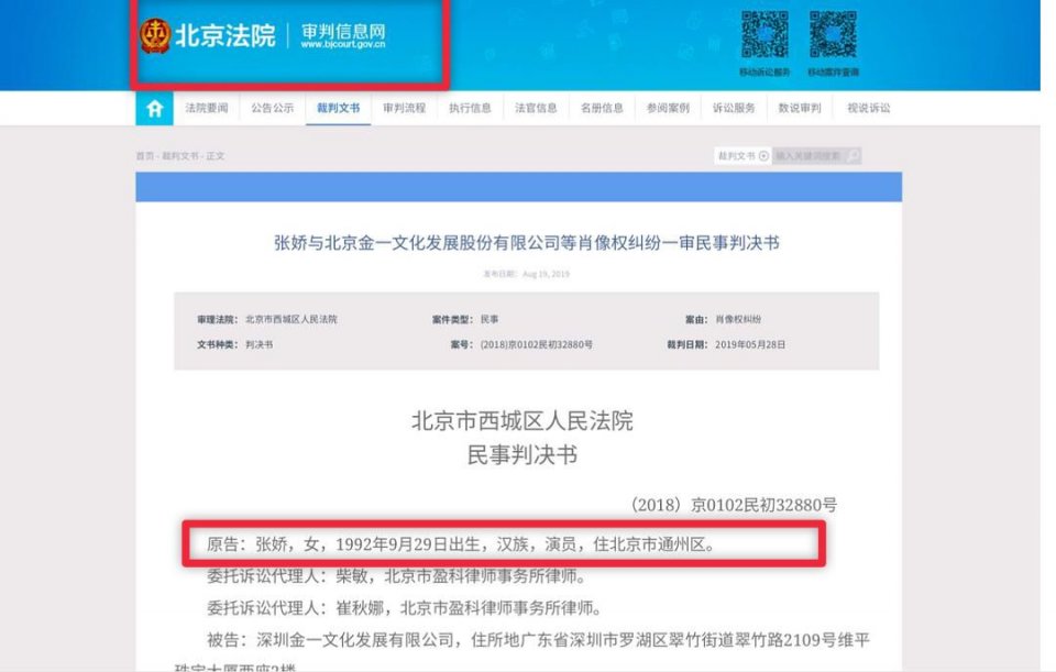 虽然身份证被称是假的,但是在2018年的时候,张天爱曾经打过一个侵犯肖像权的案子,判决书上清楚地记录着张天爱(原名张娇)是1992年出生的。法院判决书这种庄严的材料,似乎不可能作假吧.....