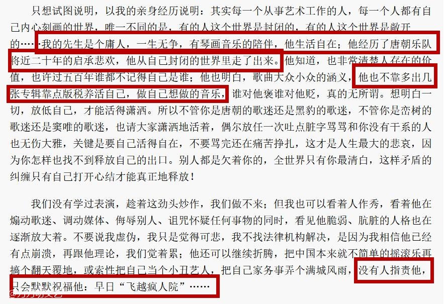 丁夫人在这封信中,表现了她的教养,但也表达了她的愤怒:“我的先生是一个庸人,一生无争,他经历了唐朝乐队将近二十年的启承悲欢,他从自己封闭的世界里走了出来”“我们没有学过表演,趁着这劲头炒作,但我也可以看人作秀,不要说我虚伪,我只是觉得可悲”。