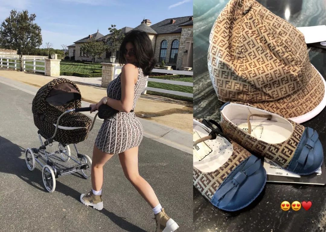 当Stormi还是个小baby的时候,坐的是Fendi的婴儿车,穿戴的是同品牌的鞋帽。
