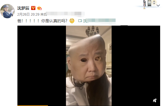 2月26日晚,沈梦辰在社交平台上晒戴面具搞怪的视频,当沈梦辰戴着郭德纲头像的面具对镜卖萌时,路过的沈爸爸却认错了,问道:“吴亦凡是吧?”吓得沈梦辰愣住了。还配文问道:“爸!!!!!你是认真的吗?”十分逗趣。