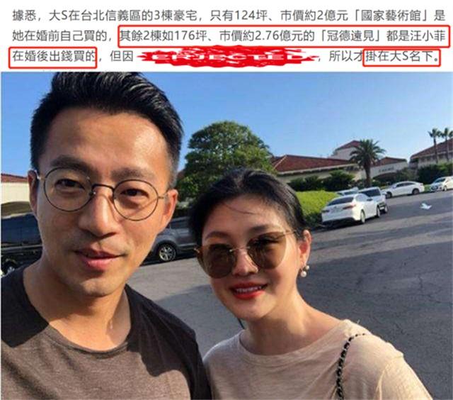 据悉,大S在台北的3栋豪宅,只有一栋面积124坪、市值约2亿元的“国家艺术馆”是她在婚前自己买的,其余两栋如面积176坪、市值约2.76亿元的豪宅都是汪小菲在婚后自己出钱买的,只是因为某些原因,所以才挂在了老婆大S的名下。