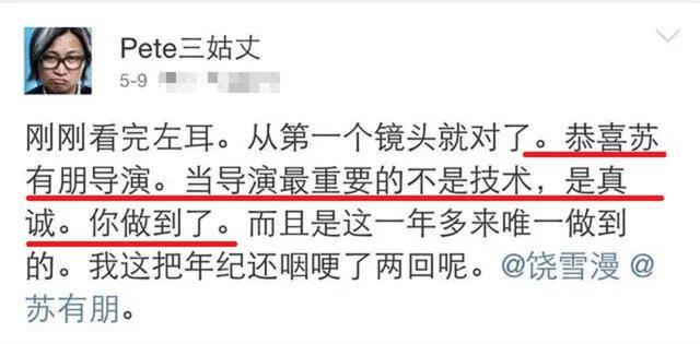 2014年,苏有朋还当起了导演,执导电影《左耳》。《左耳》上映后不仅票房大卖,就连陈可辛也发文力挺他。