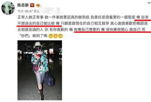 当然,陈志朋的改变也曾让不少的网友直呼无法接受。但早在2018年,陈志朋就对此做出了回应,称自己不愿意跟过去的自己做比较,只想要做自己。