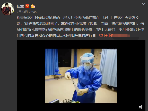 2月23日晚,任重在个人社交平台上发文致敬朝阳医院的逆行者,并制作了医护人员的音乐相册。