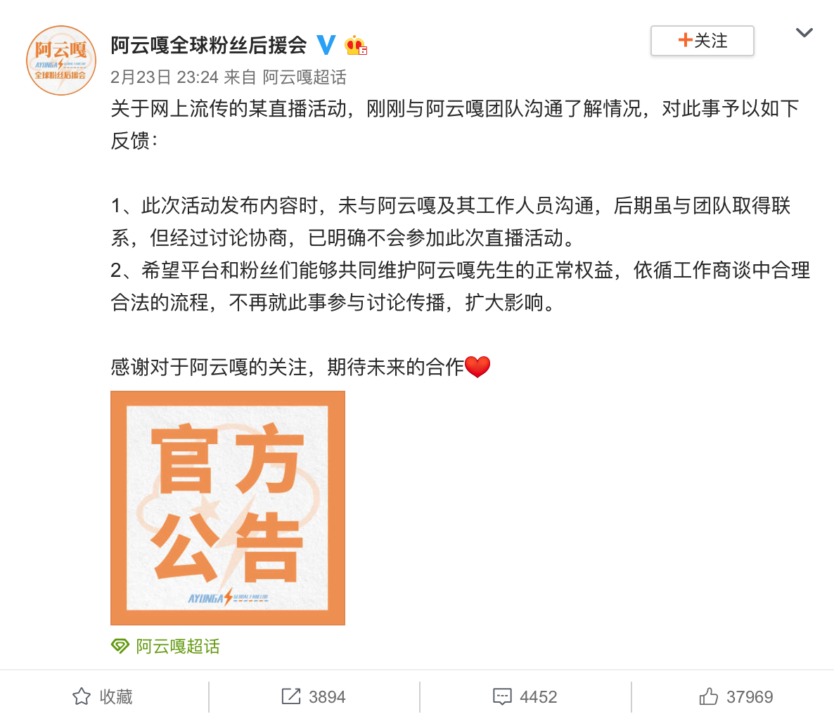 2月23日,阿云嘎全球粉丝后援会发文称,“关于网上流传的某直播活动,经过讨论协商后,阿云嘎方已明确不会参加此次直播活动。”同时,后援会还表示,因阿云嘎暂无工作团队官博,此条公示由阿云嘎方工作人员授权后援会代为发布传达。