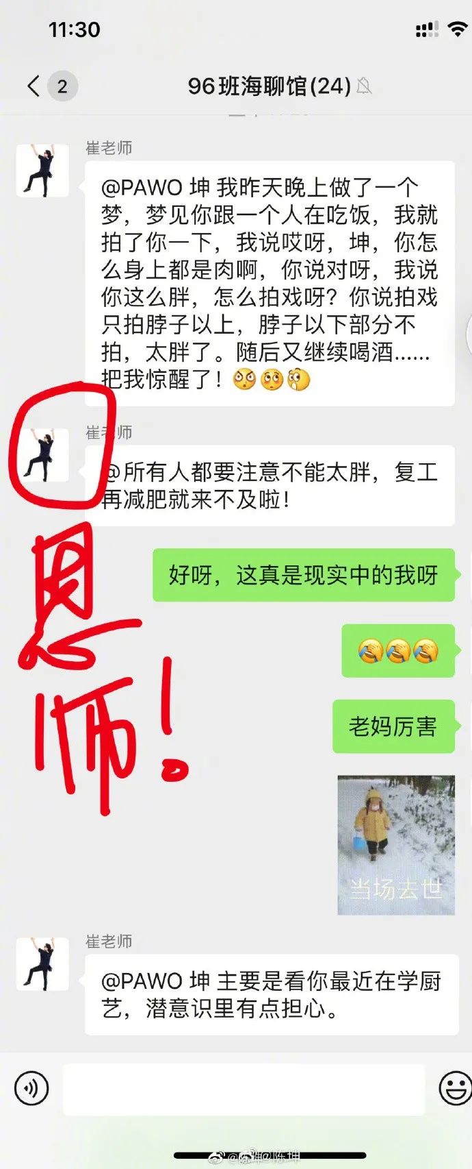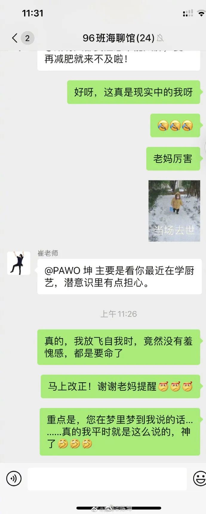原来明星也这样 今天,陈坤在微博晒出与北影96班班主任崔新琴的聊天截图,里头聊到了这阵子他疯狂展现厨艺的事儿~ 先来康康陈坤的厨艺 ↓↓ 这些菜卖相都不错,虽然味道咱也尝不到,但看起来还是很诱人的。 陈坤自己表示:又全吃光了! 星姐一边码字一边看饿了...... 有一说一,结合图片可以得知,恩师“崔妈妈”的担心不是没有道理的:她看到陈坤在网上连续多日晒出的下厨成果,担心他因钻研厨艺而长胖,并在群里提醒96班其他同学同样注意控制饮食,不能太胖~ 说来也巧,网友在这两张截图里找到了新的亮点:原来大家对微信群都是选择性静音的! 有网友说自己也会把各种工作群班级群静音免打扰,用得多的就置顶防止漏掉重要消息,大家纷纷表示深有同感。偷偷说一句,星姐也是,你们呢?
