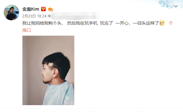 2月23日,金瀚晒出“新发型”自拍,无奈写道:“我让我妈给我剃个头, 然后我在玩手机,玩忘了,一开心,一仰头这样了。”只见照片中他左侧的头发被剃秃了一块,和浓密的胡子形成鲜明的对比。