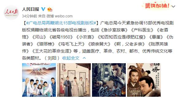 广电总局23日紧急协调15部优秀电视剧版权捐赠给湖北省各级电视台播出,包括《急诊室故事》《产科医生》《老酒馆》《河山》《破局1950》《小欢喜》《知否知否应是绿肥红瘦》《悬崖》《伪装者》《琅琊榜》《鸡毛飞上天》《娘亲舅大》《啊,父老乡亲》《陇原英雄传》《王大花的革命生涯》等,涵盖医疗、革命、农村、都市、优秀传统文化等各类题材。(刘