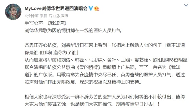 新型冠状病毒肺炎疫情持续,各界齐心抗疫,不少歌手创作新曲为医护人员打气,其中就包括了“天王”刘德