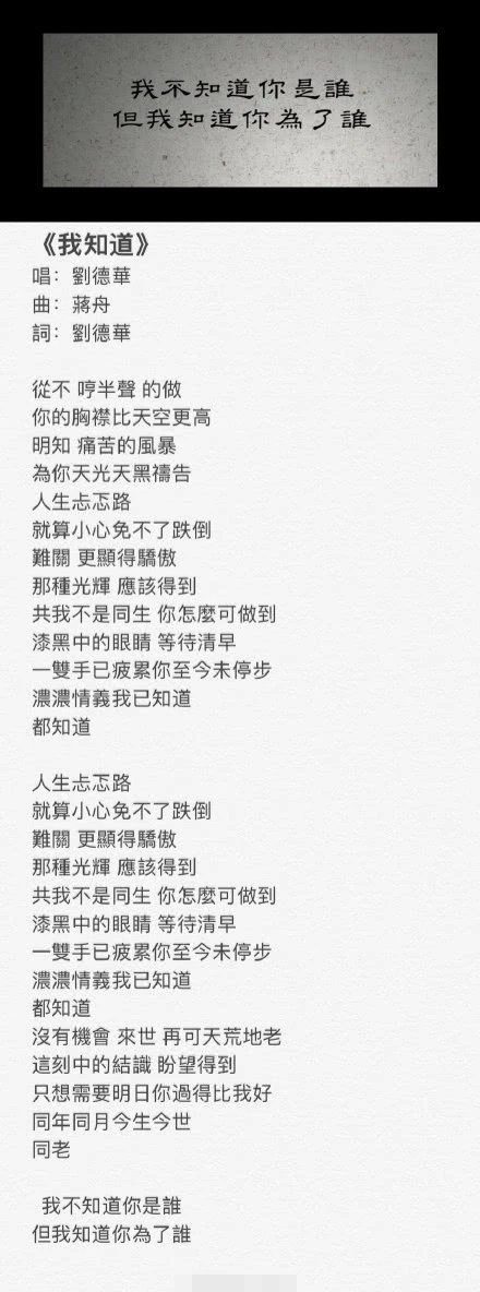 据报道,刘德华是被网络一张照片上的句子所感动,而受到启发创作新歌,那句话是:我不知道你是谁,但我知道你为了谁。