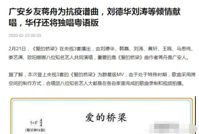 2月21日,由福建籍词作家邹友开作词、省音乐家协会副主席蒋舟作曲的抗疫新歌《爱的桥梁》正式在央视播出。