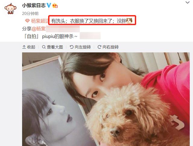 2月22日,杨紫在社交网站上晒出了一组最新的自拍照,配文表示:“有洗头;衣服换了又换回来了;没胖”,女神抱着自家的爱宠营业美貌引来不少粉丝大呼惊
