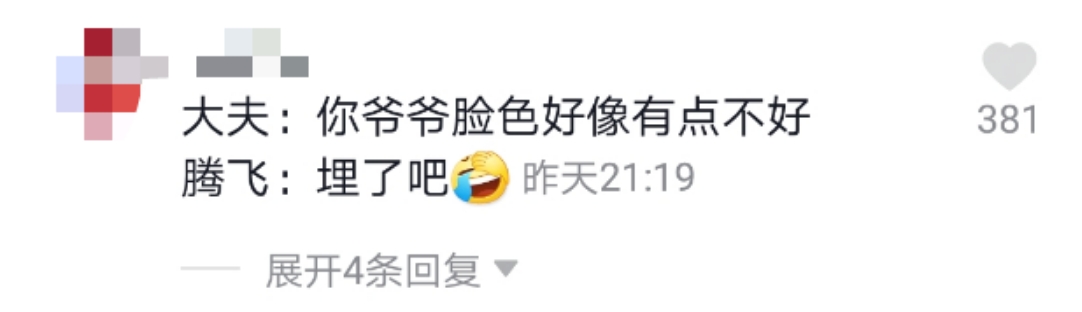 还有网友给“谢飞机”支招,说道:“大夫:你爷爷脸色好像有点不好。腾飞:埋了吧。”