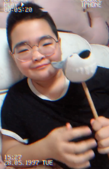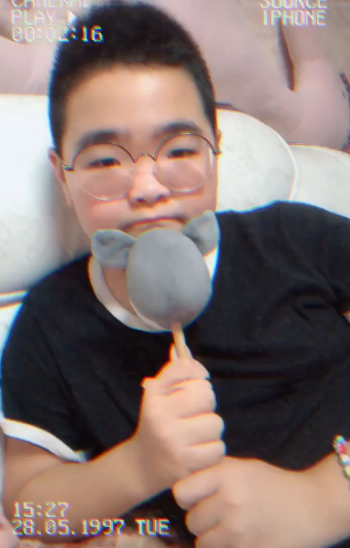 视频中,“谢飞机”穿着黑色短袖,手中拿着小狼玩偶的捶背棒。他将下巴抵在玩偶的脑袋上,肉肉的脸颊配上圆圆的镜框,特别可爱。