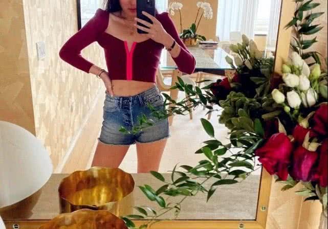 红色短上衣,蓝色超短牛仔裤,锁骨异常突出,腰以及胳膊和腿都非常细。