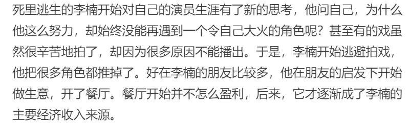这一句话就能看出李楠肯定是个好丈夫好爸爸,他社交媒体很少更新,也有两条陪伴女儿的内容,在意识到自己的演艺生涯没有太大发展之后,他也很快在朋友的启发下开了餐厅,在一段时间的运营之后,餐厅也成了他主要的收入来源。