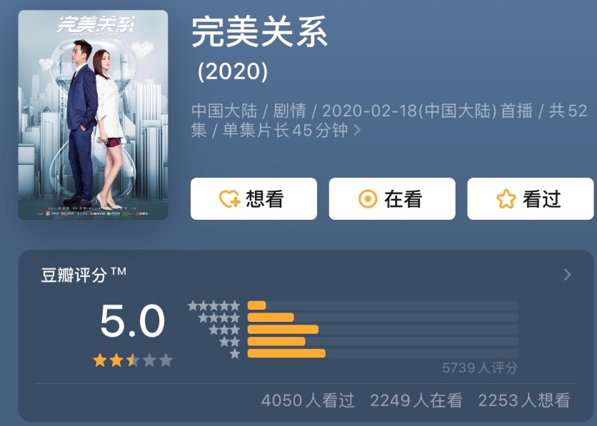 最后从剧的热度和讨论度来看,《完美关系》开播当天收视破2 ,又创下了一个收视高峰,然而赢了高收视却输了好口碑,从开播之日就是满屏幕的吐槽声,一部题材新颖的职场剧却变成了狗血的玛丽苏剧,豆瓣分5.2分,不到一天的时间就掉到了5分。