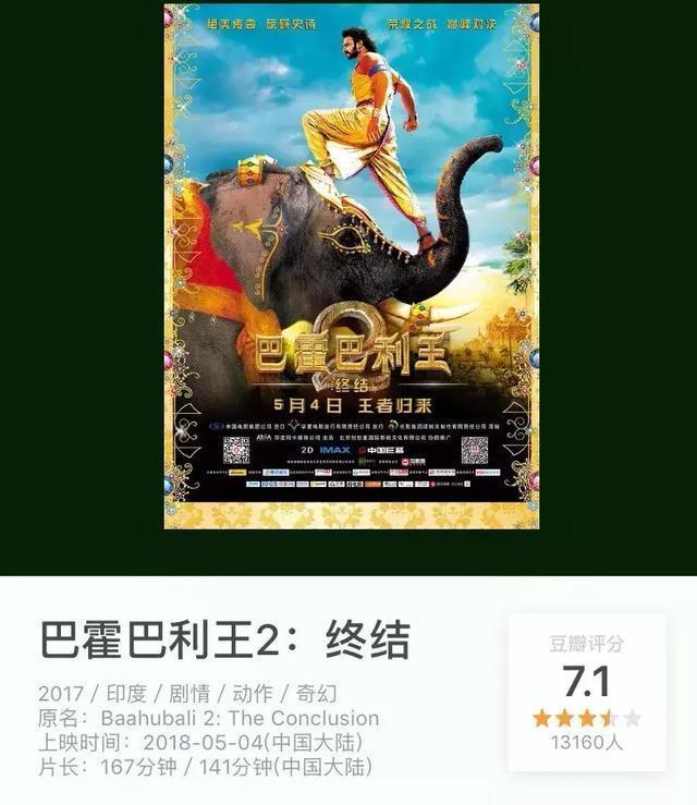 这部印度历史票房冠军,中国影迷早已重新开始认识并定义印度片了不夸张的说,印度靠此片征服了全球。《巴霍巴利王2:终结》作为首登IMAX影院的印度片,本周五上映,在毫无宣发的情况下,仅两天就取得3358.7万票房,豆瓣评分达到7.1分。