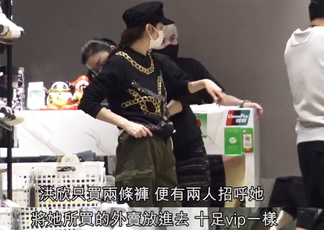 之后两人一起去了潮牌店卖衣服,老公张丹峰坐在一旁等待洪欣试穿,旁边有两位服务员帮忙,也是十足VIP,最后洪欣选了两条绿色裤子作为战利品,