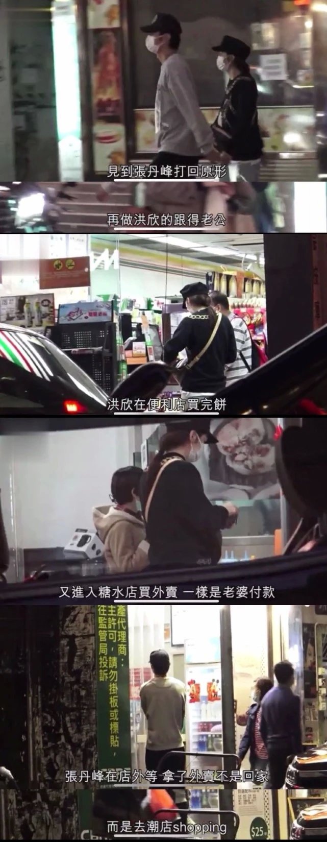 此行满载而归,夫妻结伴回家吃甜品,张丹峰拿着两大袋战利品,老公力十足。洪欣左手提着一小袋甜品,整个人与老公紧贴走路,十分小鸟依人,看背影都觉得二人十分幸福。