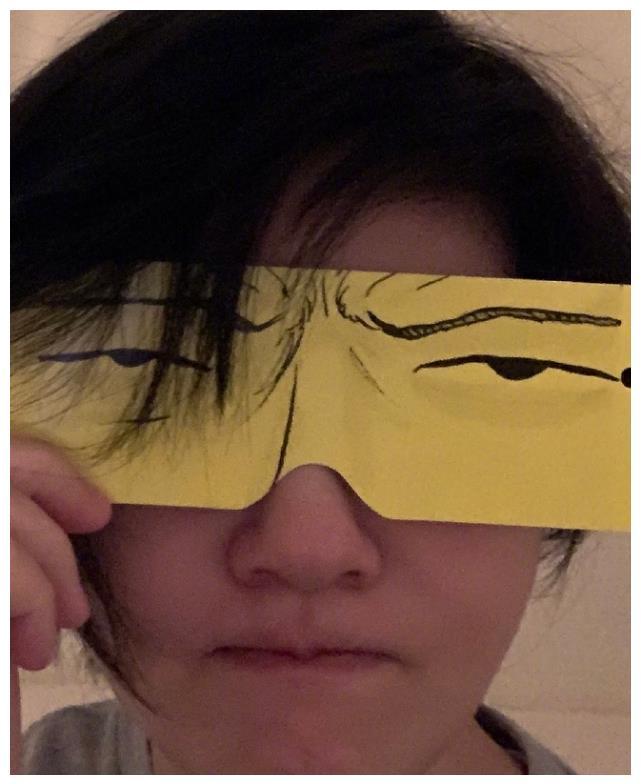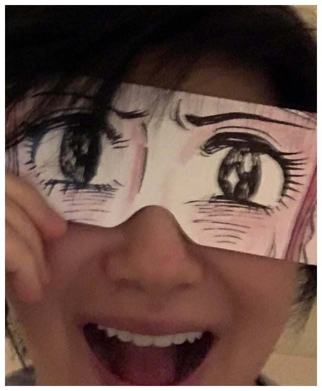 而第二张,就比较卡哇伊了,这次自制的眼罩,是卡通漫画人物中独特的大眼睛,冰凌的炯炯有神,非常可爱。这次大S很配合地做出开怀大笑的唇形,与眼罩蛮相配的,看来宅在家没事的她,也蛮会自娱自乐的。