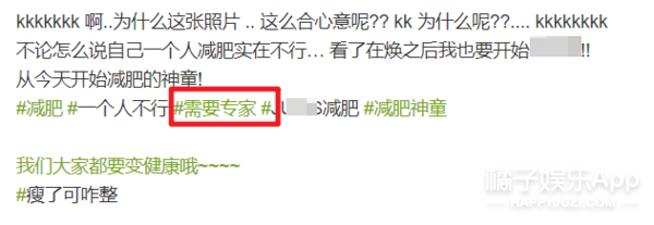 “减肥没有成功一说。是需要一辈子去克制的,就像吸烟和饮酒一样,需要每天每天去克制和忍耐。肥胖也是一种病,希望大家可以给正在努力减肥中的人们予以应援和掌声”