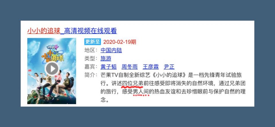 有一次,我们在讨论有啥综艺好看,有同事就说你去看下XXXXX吧,我说好,然后打开了网站,看到简介写着“讲述四位兄弟前往感受即将消失的自然环境”“感受男人间的热血友谊