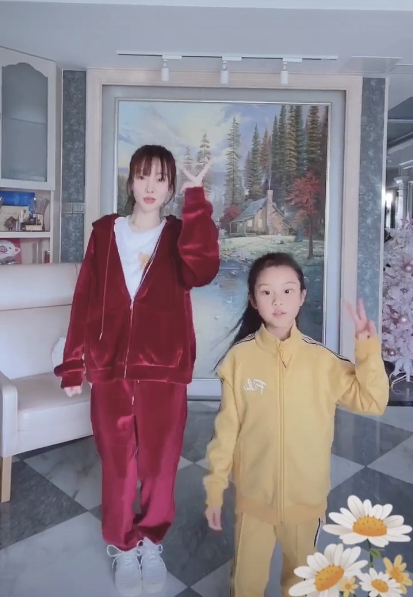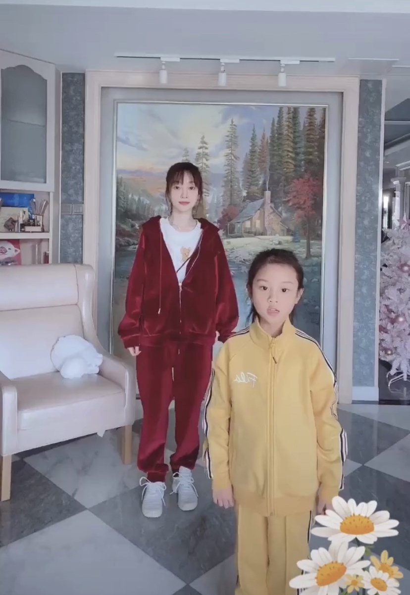 视频中,李小璐身穿红色运动服梳着马尾青春活力,甜馨则穿着一身黄色运动服,站在妈妈前面。