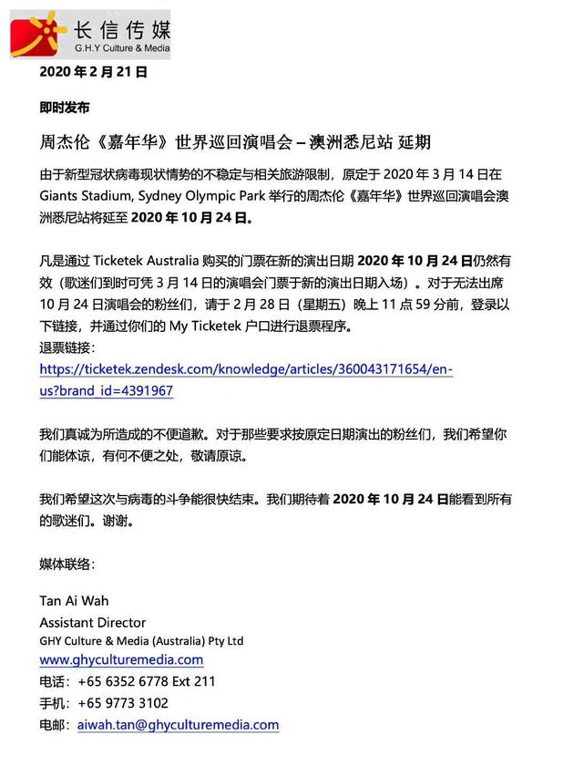 2月21日,周杰伦演唱会主办方长信传媒发布公告,由于新型冠状病毒现状情势的不稳定与相关旅游限制,原定于2020年3月14日在Giants Stadium, Sydney Olympic Park举行的周杰伦嘉年华世界巡回演唱会澳洲悉尼站将延至2020年10月24日。