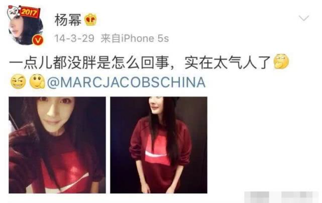 杨幂在怀小糯米的时候发过一个微博,称:一点儿都没胖是怎么回事,实在太气人了,并配图了一个窃喜的表情。照片中的杨幂穿着宽松卫衣,不仔细看都看不出已经怀孕七八个月的肚子,胳膊也是十分纤细。