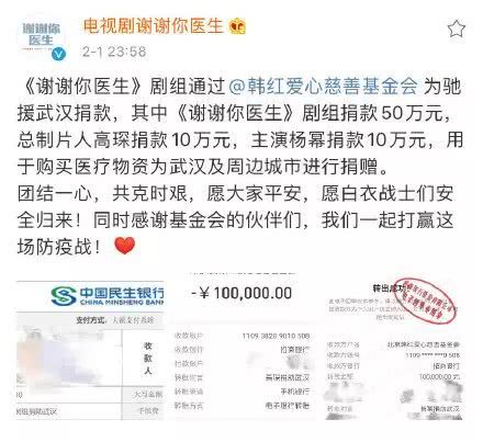 疫情无情人有情,在这场没有硝烟的战争中,《谢谢你医生》剧组通过韩红捐款50万元,主演杨幂捐款10万元,杨幂以个人名义捐赠20万元;