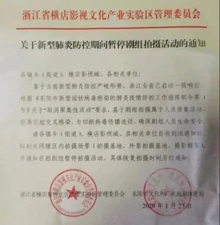 浙江全省已启动一级响应,关于“取消聚集性活动”的要求,基于剧组拍摄属于人员密集活动,容易引起交叉感染……具体恢复拍摄时间另行通知。