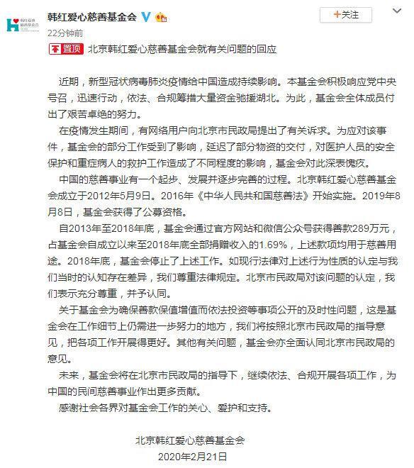 21日,北京韩红爱心慈善基金会就有关问题的回应: