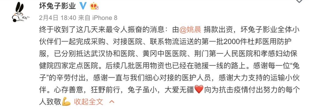 自己的坏兔子影业捐赠了2000件防护服,2月4日抵达武汉,还有物资在继续筹集。