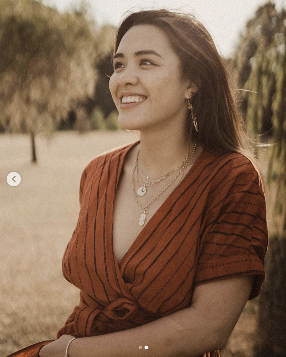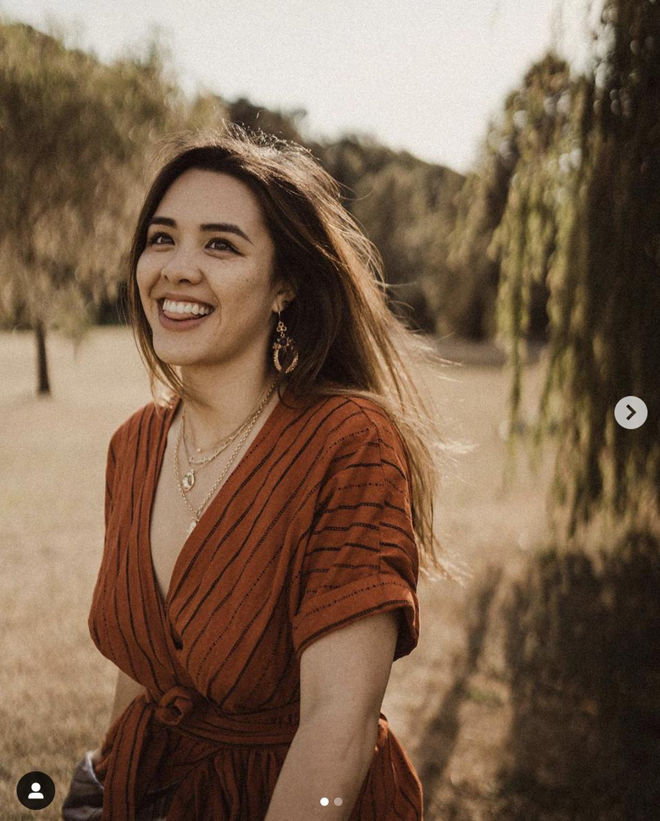 照片中,她身穿棕色长裙露出灿烂笑容,吐着舌头卖萌,美丽又可爱。