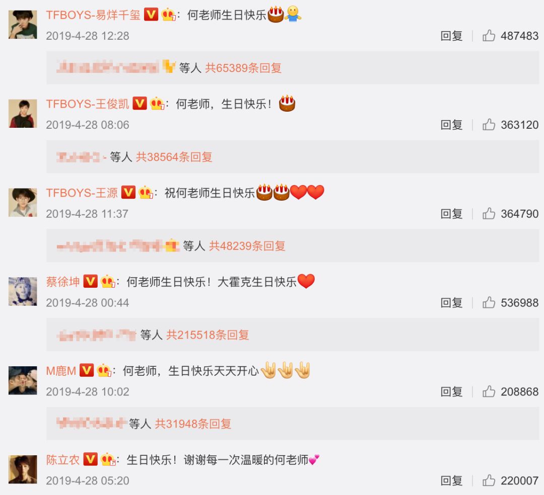 生日微博评论超过100w,集齐了大半个圈里明星的祝福。