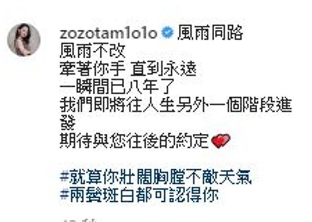 谭凯琪当晚还在社交网晒出一张照片,照片中的她穿上白色纱裙,由一名看不见样貌的男士拖着她,疑似同未婚夫拍婚纱相,她发文说︰”风雨同路,风雨不改,牵着你手,直到永远,一瞬间已八年了,我们即将往人生另外一个阶段进发,期待与您往后的约定。”