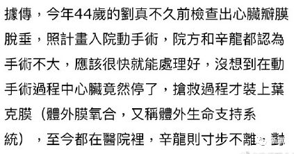 原因是今年44岁的刘真前不久查出心脏瓣膜脱垂,按照计划今年2月入院做手术,当时院方和辛龙都认为手术不大,应该很快能处理好,没想到在手术过程中出现心脏骤停,抢救过程中装上了ECMO,目前状况不太乐观。