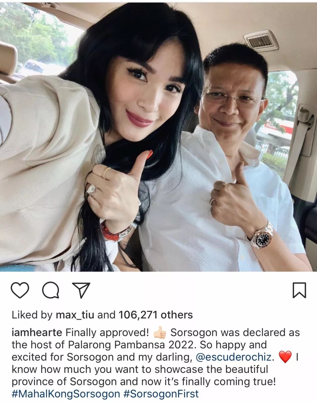 ▲ 同年9月,Chiz宣布竞选副总统。Heart的母亲更是出现在了选举活动现场,也是有种活久见的感觉。至于父亲因为患病未能亲临到场,也发来了祝福表示会全力支持。