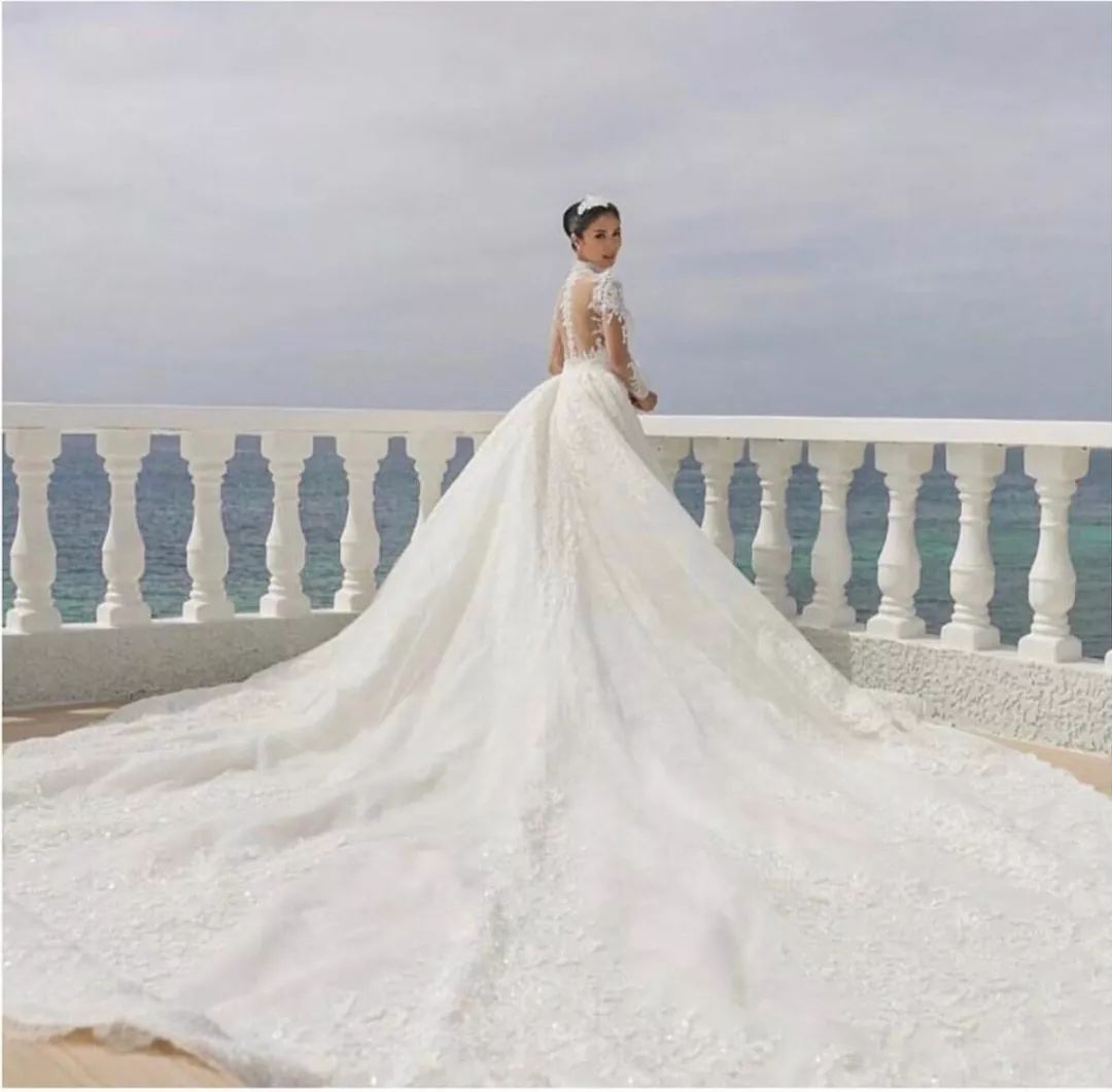 ▲ 身着蕾丝刺绣,配上巨大的拖地白纱,她回眸一笑,笑靥如花。