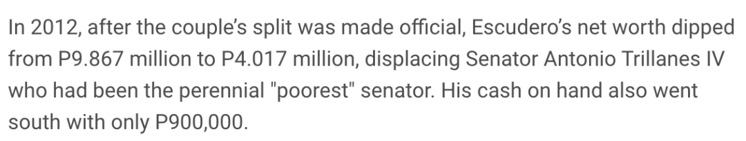 ▲ 因为和前妻的分开,Chiz把自己名下大量的个人财产转让给了前妻和双胞胎子女,2012年他手中净资产只剩下401万比索(折合人民币55万),手里现金是90万比索(折合人民币12万5),直接被评为全菲律宾“第二穷”的参议员。说实话这点钱的确连Heart的几个包都买不起啊。