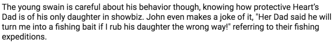 ▲ 但John在采访里多次表示,Heart的爸爸对她十分保护,希望等到女儿成年后再交往对象,不想让她受到一丝伤害,可以猜测分手原因也许和父母干预脱不了关系。