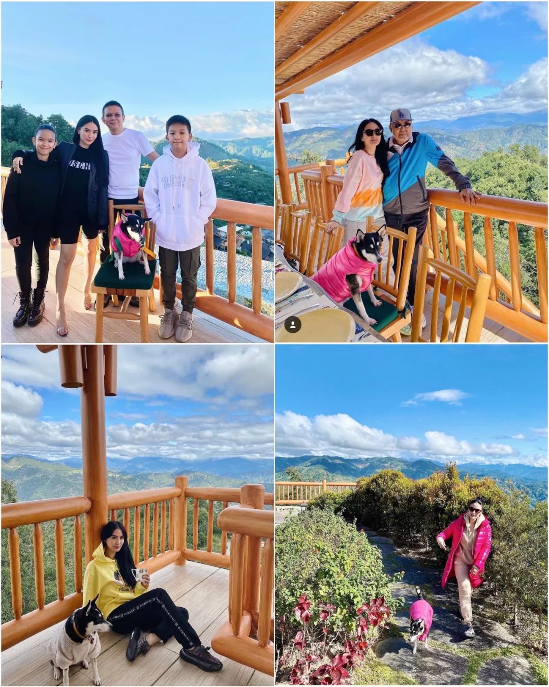 ▲ 今年跨年是全家一起去山里小住,和爸爸和丈夫和孩子们在一起,连小狗身上穿的都是和她配套的moncler羽绒服。