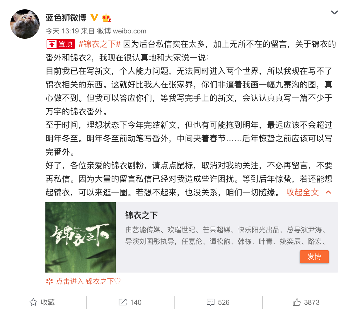 任嘉伦、谭松韵等主演的《锦衣之下》日前收官,不少意犹未尽的粉丝给原著作者蓝色狮发私信,求出番外和《锦衣2》。2月20日下午,蓝色狮回复称自己现在正在写新文,“所以我现在写不了锦衣相关的东西。但我可以答应你们,等我写完手上的新文,会认认真真写一篇不少于万字的锦衣番外。”她同时表示,希望剧粉不要再留言和发私信,“因为大量的留言私信已经对我造成些许困扰。”