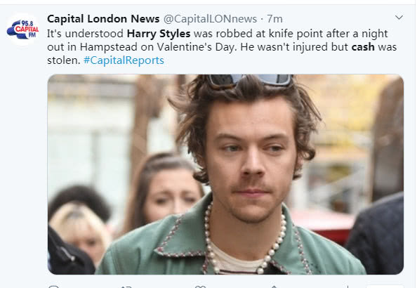 据英国《镜报》报道,著名的英国男演员哈里·斯泰尔斯Harry Styles在情人节当晚11点左右,在伦敦遭到了一名男子持刀抢劫。持刀抢劫犯用刀抵着哈卷,想从他身上抢走现金。持刀抢劫犯还命令哈卷在附近的取款机给他取现金,哈卷只好照做。
