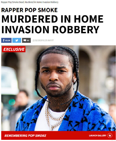 2月19日,据外媒报道,新人说唱歌手Pop Smoke在家中遭到两名男子抢劫,最终不幸中枪身亡,年仅二十岁。