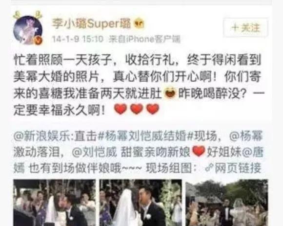 14年杨幂大婚,李小璐更是以带孩子的理由,直到在婚礼第二天才转发了一条新浪娱乐的微博进行祝福~